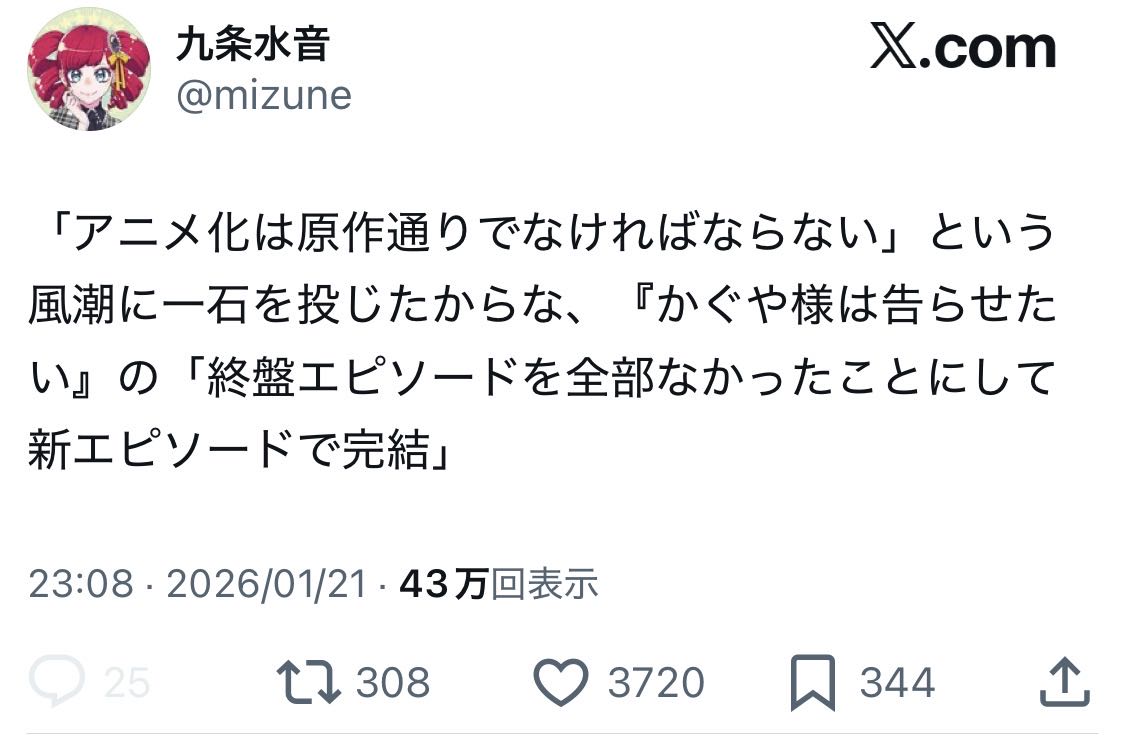 | … | 5626/01/27(火)10:23:43No.1396291058+>かぐや様のアニメってラスト違うんだ… |