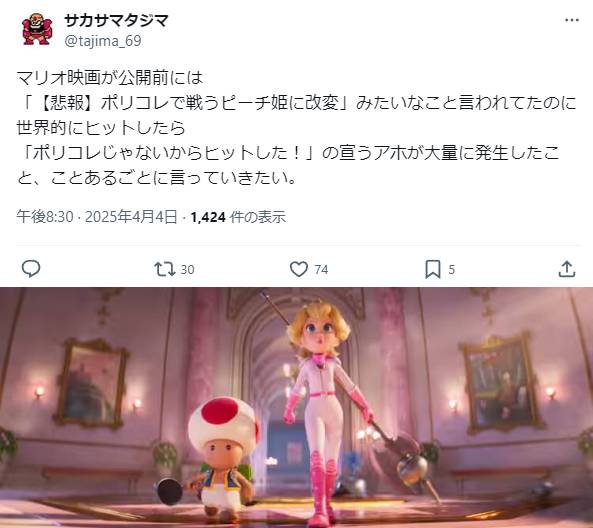 | … | 57026/01/27(火)13:14:22No.1396328393そうだねx2いって映画作中でマリオってどんなやつなの?から騒動に対してのスタンスとかヒーローとしてのメンタリティも描写されてるんだからマリオ知らなくても楽しめると思うけどなぁ |