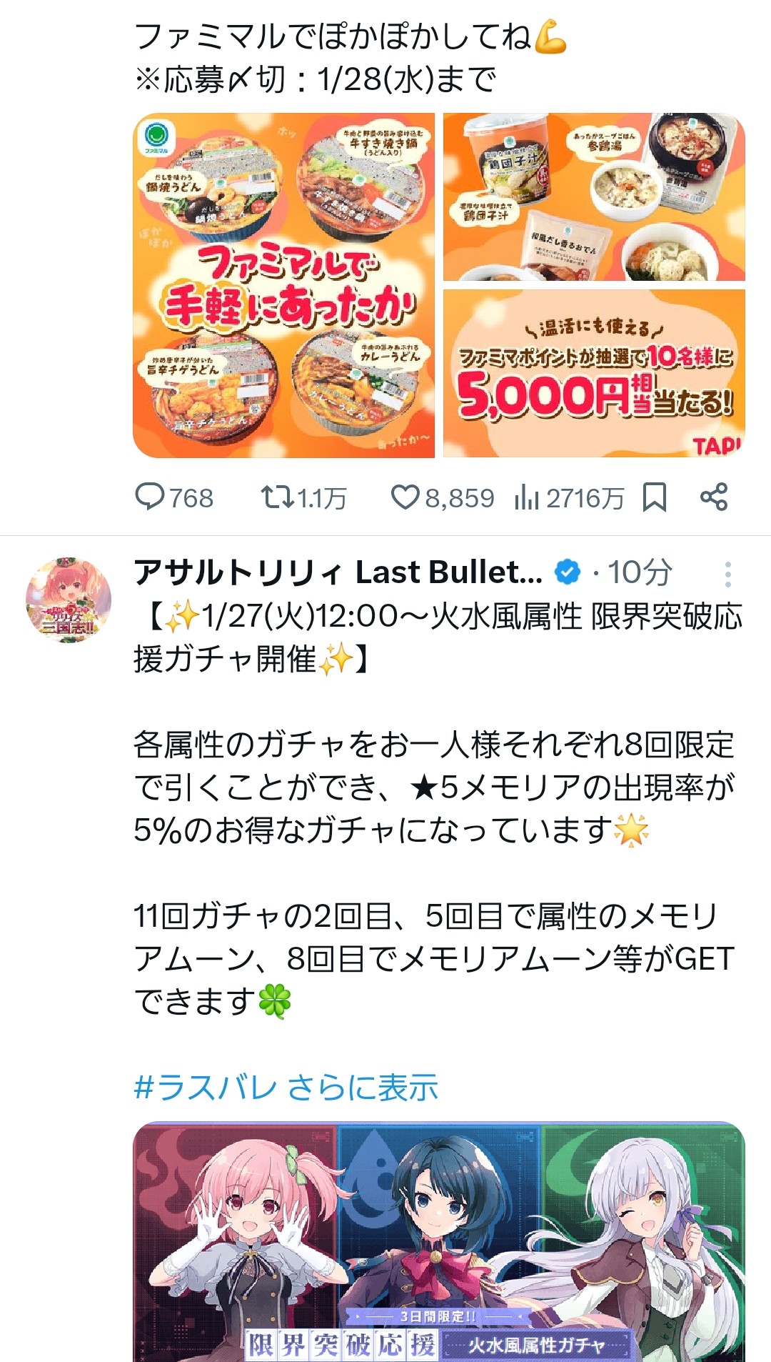 | … | 126/01/27(火)12:06:18No.1396309699+バトルパーティーは本日23:59までですわ!指令書の使い忘れに注意してくださいまし |