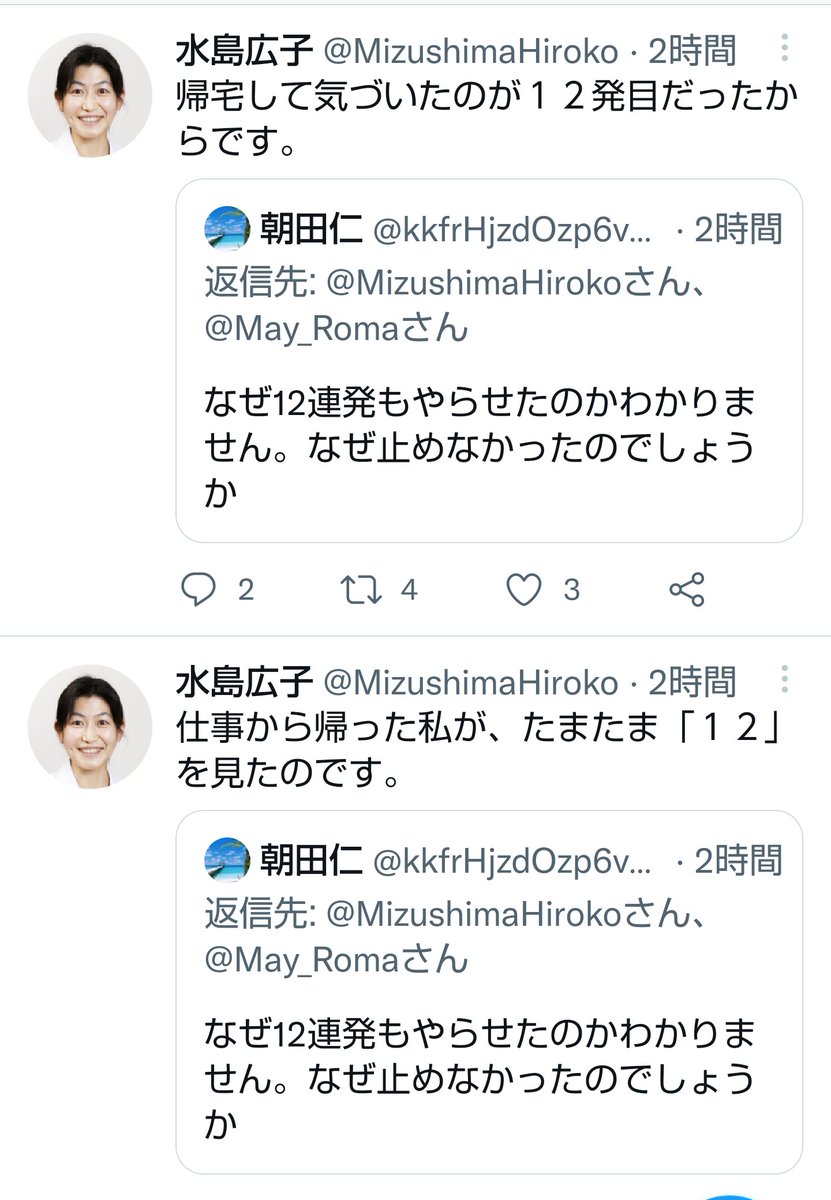 | … | 4726/01/27(火)17:35:43No.1396382241そうだねx6「私の毒夫は、結婚後5年間様子をみて『まあよい親になるだろう』と思って子どもを作ったにも関わらず、3歳の娘の顔に12連発の蹴りを入れて(仕事帰りの私が目撃した)息子の顔もよく殴ったし、家族を支配した」と明かした。刑事事件化せずに隠していた理由について、当時は自身は国会議員かつ男女共同参画の旗振り役であったため、「『ほらね、男に子育てを任せるとこうなるでしょ』と言われたくなかった。」「男の問題ではなく性格に難ある夫の問題に過ぎなかったので」などと、当時の自身の立場と影響を考慮して事件化しなかったと述べている。「なぜ止めなかったか?」とのリプライに対して、水島は「仕事から帰った私が、たまたま『12』を見たのです」「帰宅して気づいたのが12発目だったからです」と理由をリプライした。その後も「気付くまでの11発は誰が数えていたのか」「成人男性が3歳児の頭部を12回も蹴ったら殺してしまうのでは」「12連続もの足技を使う夫は何者なのか」「自宅にコンボゲージでもあるのか」などの指摘や疑問が相次いだが、水島はこれらを黙殺し、のちに一連のツイートを削除している。 |
