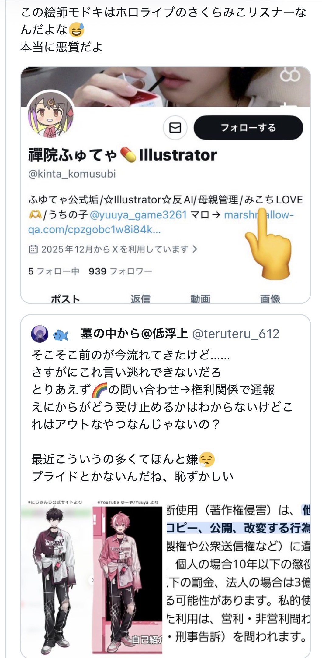 | … | 23826/01/27(火)19:29:20No.1396414104+ホロライブ関連の公式発表だと必ず入る言いがかりが |