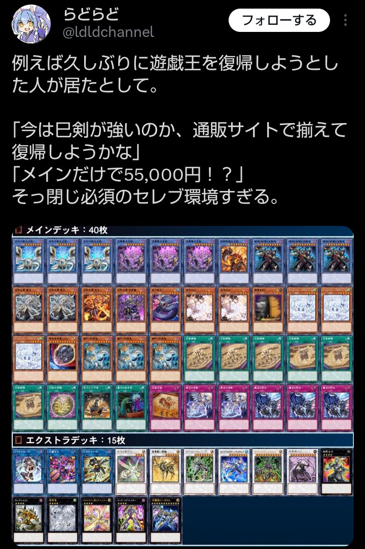 | … | 2426/01/27(火)18:22:25No.1396393071+そもそも巳剣が高いだけ他にもっと安い環境デッキあるしね |
