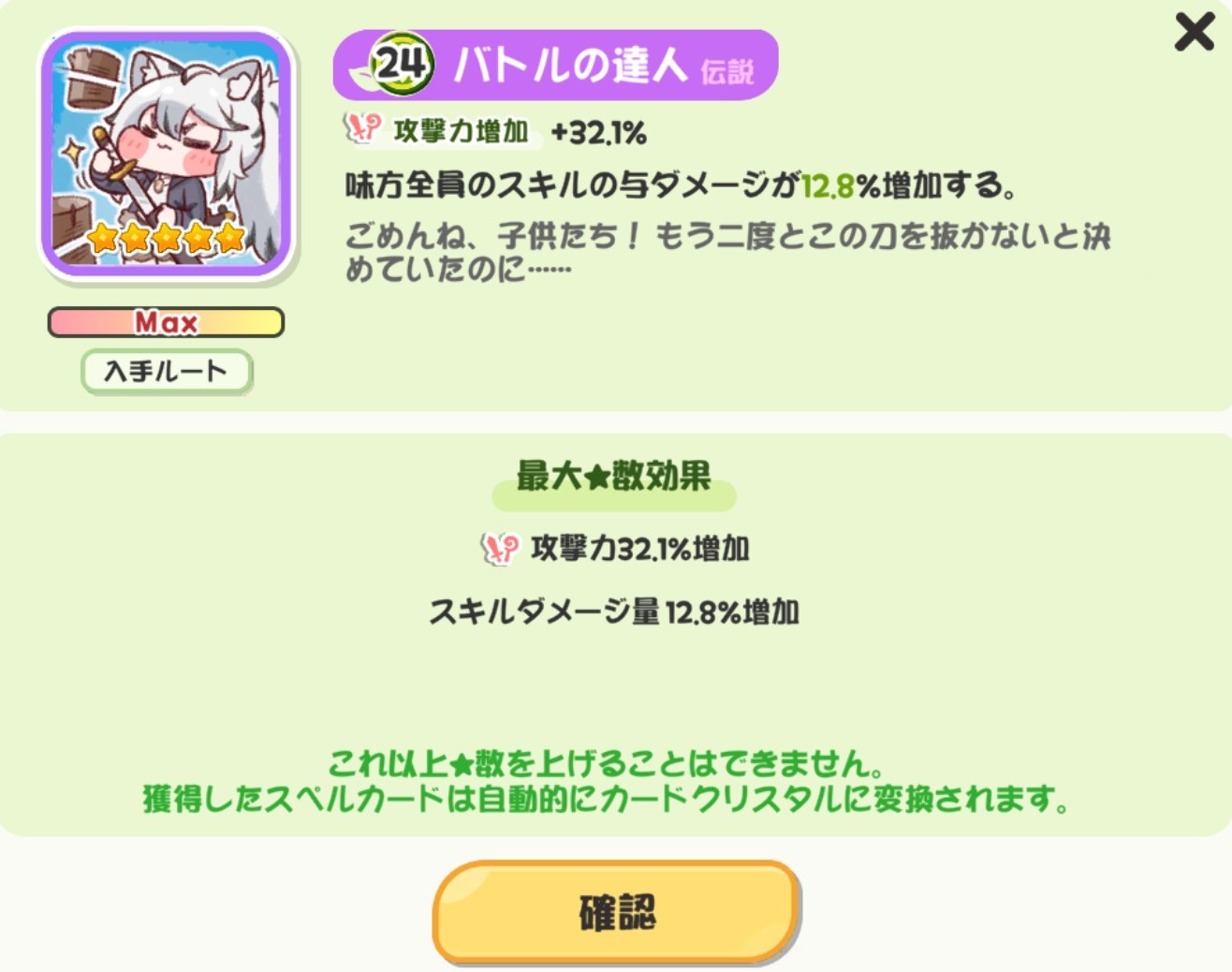 | … | 49826/01/27(火)20:43:18 ID:MN2UWLgUNo.1396441748+>「」ミーは完凸バトルの達人持ってるにゃん |