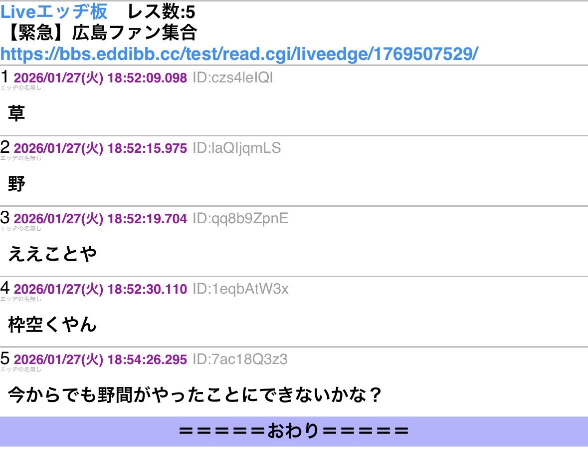 | … | 57026/01/27(火)21:48:56No.1396468284そうだねx3>カープファン震えてるか〜? |