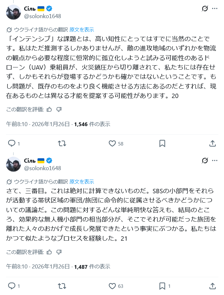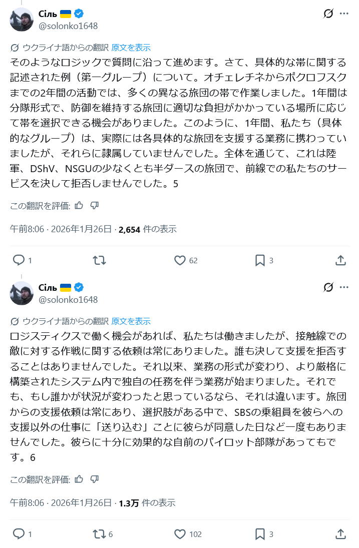 | … | 126/01/27(火)20:28:36No.1396436016そうだねx46>先日ウクライナのドローン部隊が前線の歩兵が本当に倒してくれるもん倒してないって文句が前線から出てるってスレ立てたんだけど |