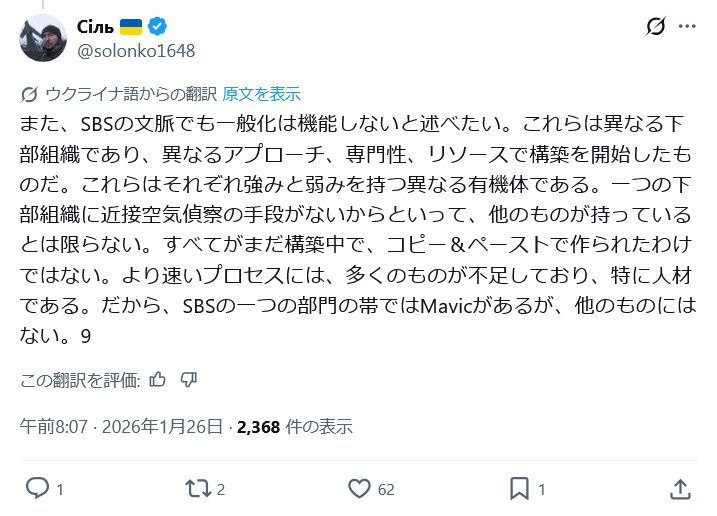 | … | 6326/01/27(火)21:19:42No.1396456347+緒戦ではDJIマビックに82㎜迫の弾頭抱かせたような間に合わせでも脅威だったが |