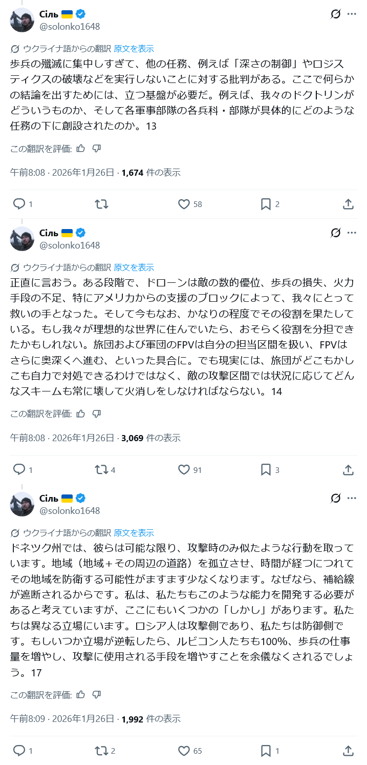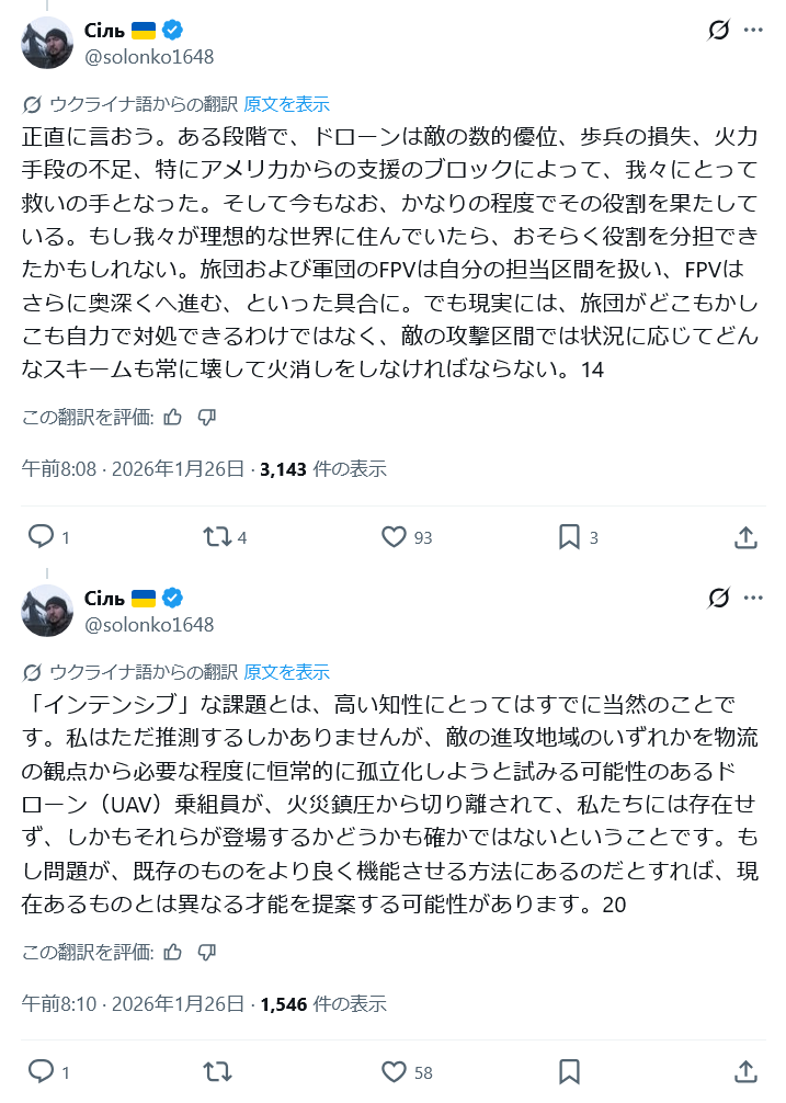| … | 5726/01/27(火)21:13:55No.1396454026+>>先日ウクライナのドローン部隊が前線の歩兵が本当に倒してくれるもん倒してないって文句が前線から出てる |