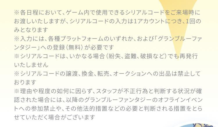 | … | 56726/01/28(水)00:50:40No.1396527310そうだねx2>※理由や程度の如何に因らず、スタッフが不正行為と判断する状況が確認された場合には、以降のグランブルーファンタジーのオフラインイベントへの参加禁止や、その他法的措置などの必要と判断される措置をとらせていただく場合がございます |