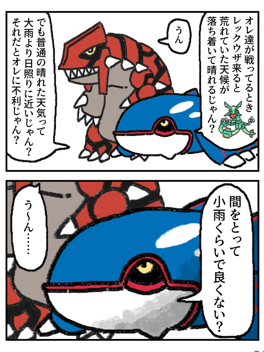 | … | 326/01/28(水)02:51:00No.1396543699+小雨だと今度はカイオーガに寄りすぎてるしグラードン側にも寄せてレックウザの威厳も考えると時折晴れ間さす薄曇りぐらい |