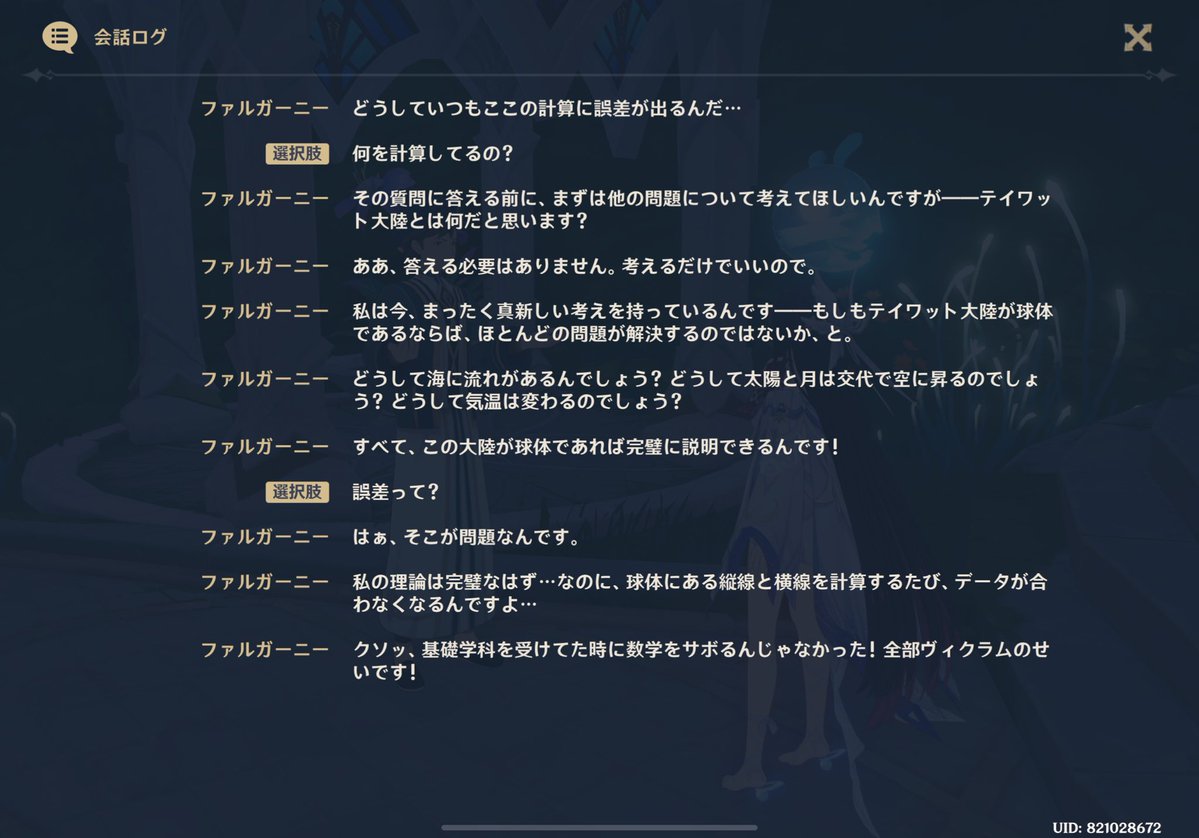 | … | 27326/01/28(水)14:24:44No.1396628077+>>今回テイワットが球体なの判明したからモンドから東にずっと行ったらリゾートにたどり着くはずなんだよなぁ |