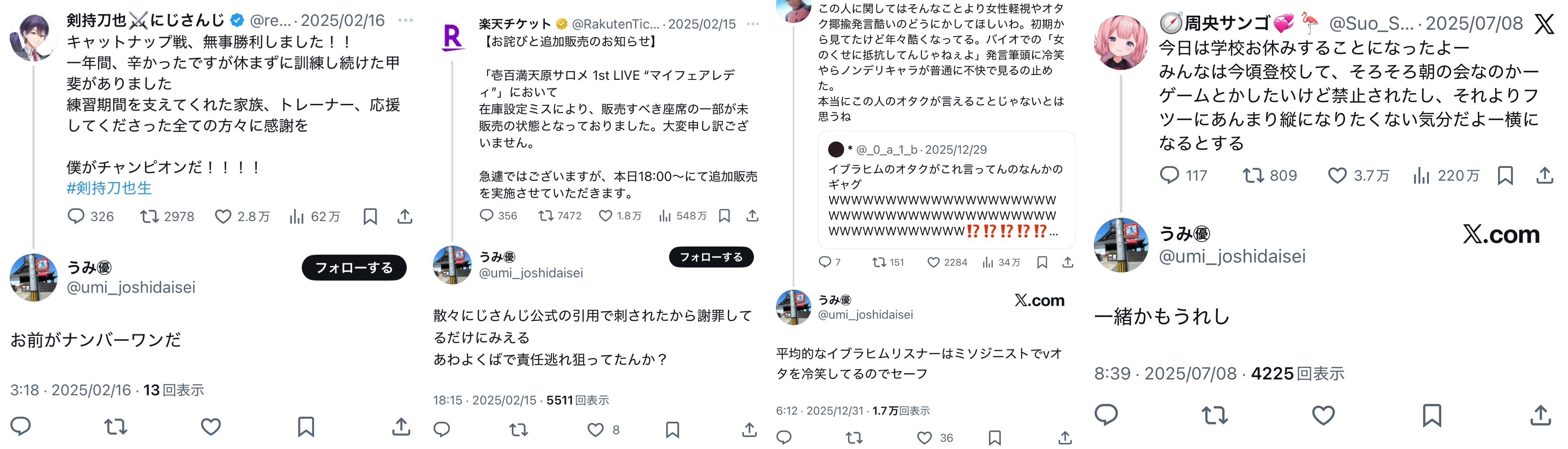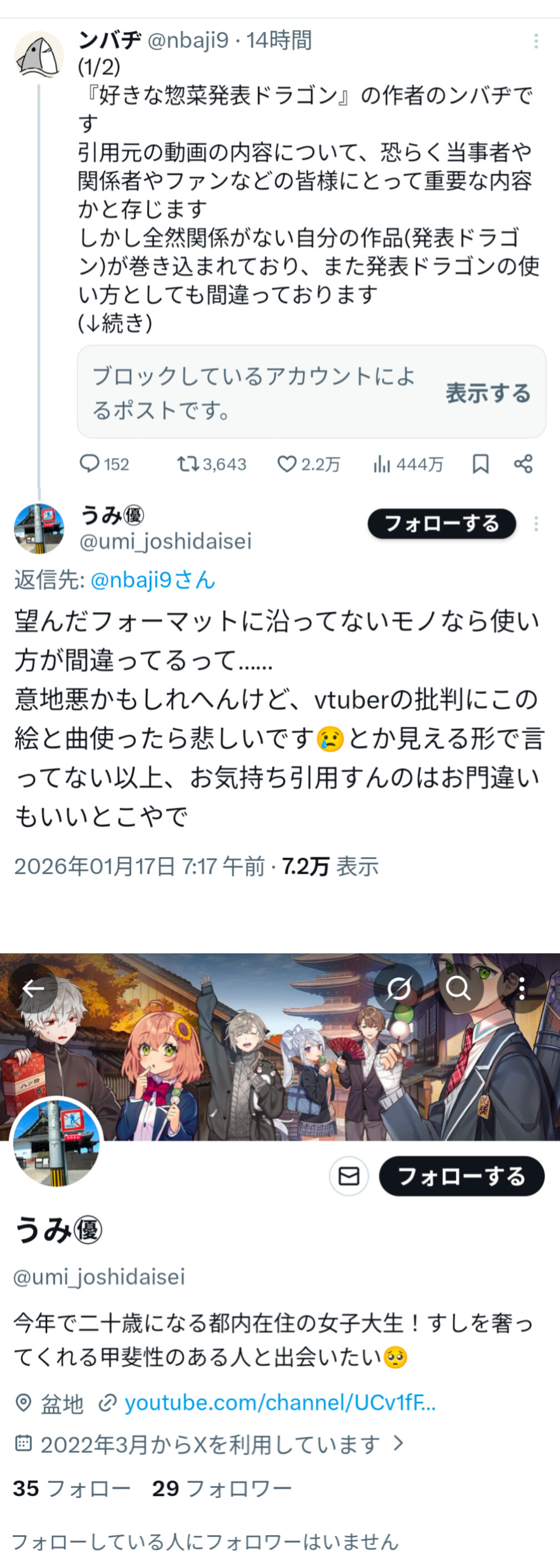 | … | 5926/01/28(水)15:37:05No.1396643472そうだねx1>これスレ画の人の警告ツイートに対してぶら下がってお前に止める権利ねぇだろ!とかキレてるのがにじさんじのファンばっかで怖かったんだよね |