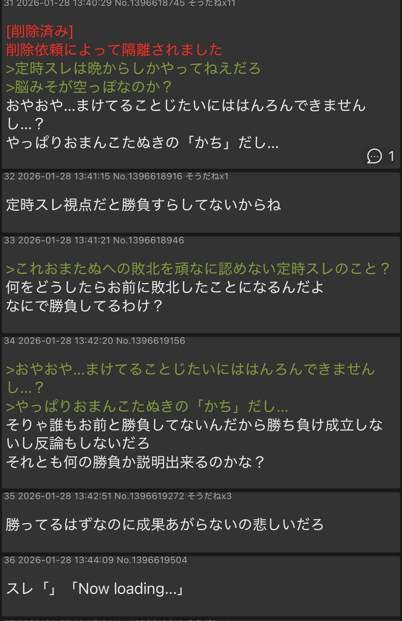 | … | 7826/01/28(水)18:43:39No.1396687156+スレッドを立てた人によって削除されました |
