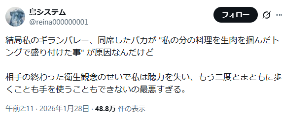 | … | 4526/01/28(水)17:59:28No.1396674804そうだねx27生肉用のトングで配膳する奴はバカですと言われたら |