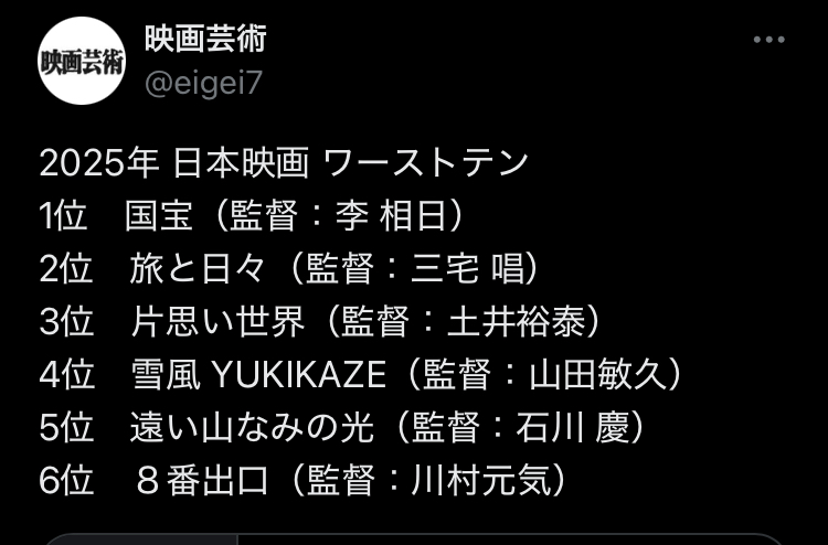 | … | 17226/01/28(水)21:14:21No.1396748182+>>2025年 日本映画 ベストテン |