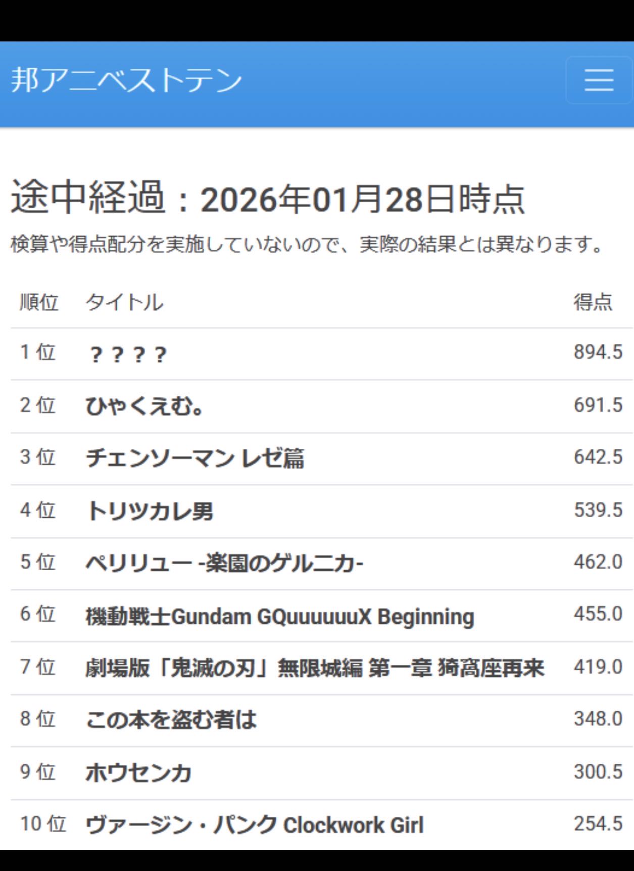 | … | 18026/01/28(水)21:15:28No.1396748735+>邦画ファンたちが選ぶ今年のアニメ映画ランキング(途中経過)は納得できるようなできないような… |