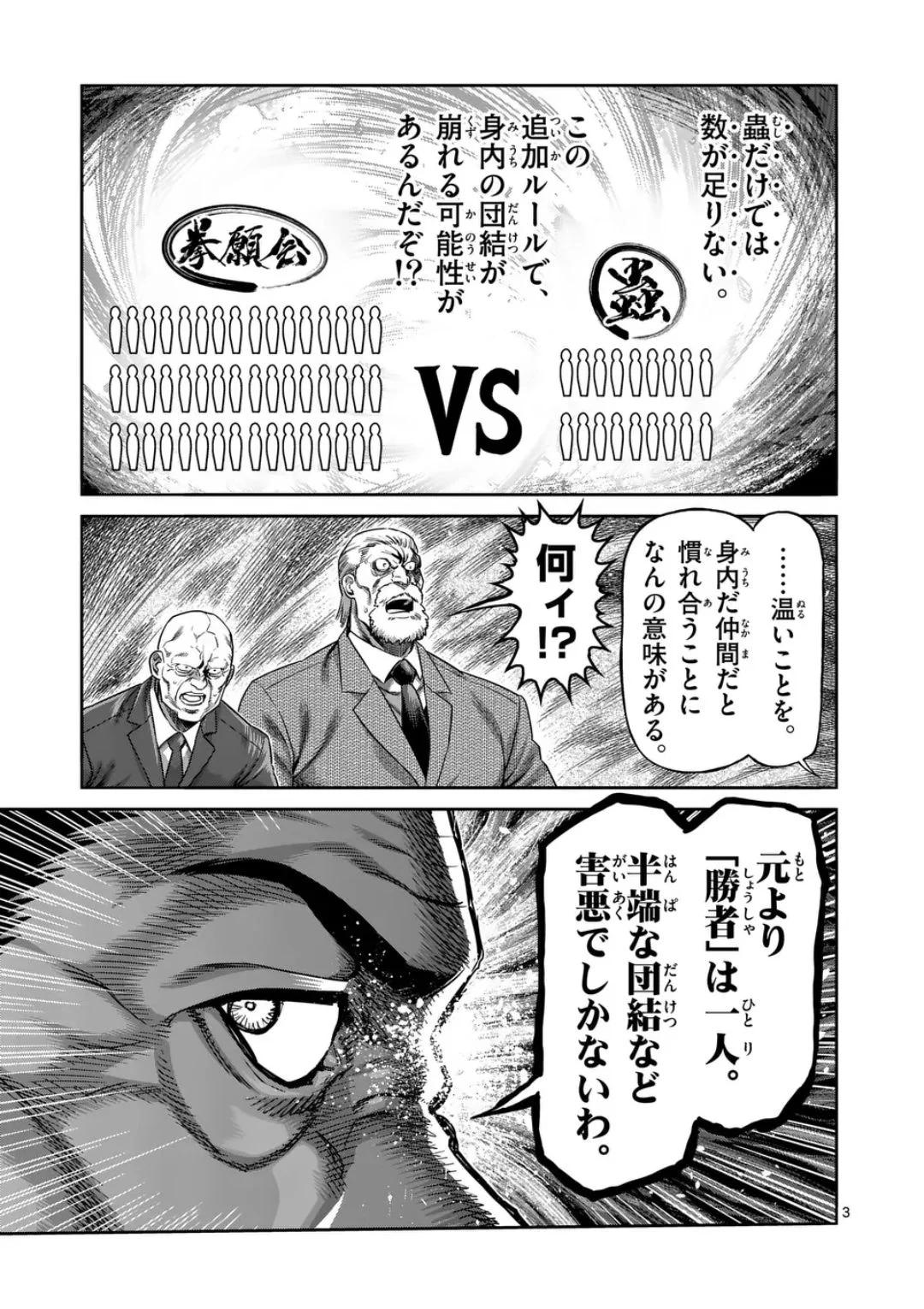 | … | 12626/01/29(木)00:45:26No.1396822383+組み合わせ関係なくとにかくこの場で戦いを多く発生させるメリットが当然ケンガン側にはあるんだよ |