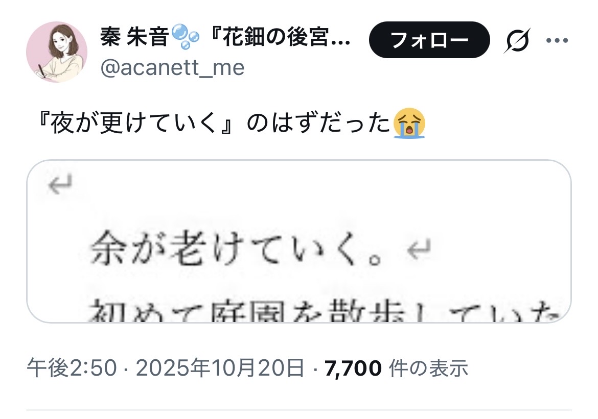 | … | 426/01/29(木)13:30:28No.1396914264そうだねx27次の文章的に散歩程度で身体の衰えを実感したのかな…で続きそうなのもずるい |