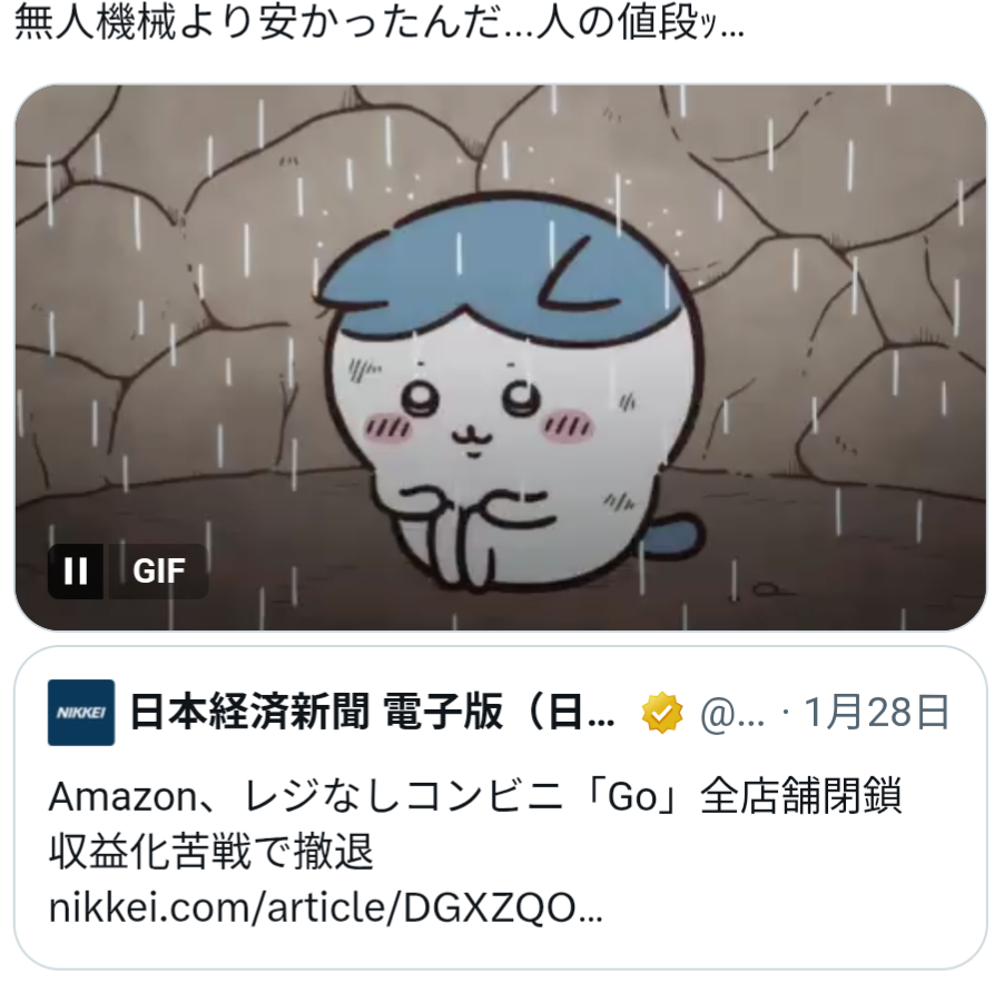 | … | 526/01/29(木)16:21:02No.1396950316そうだねx31安かったらもっとコンビニ無人化してるだろうな |