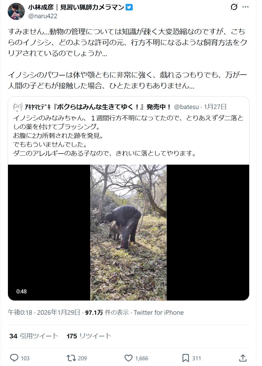 | … | 2726/01/29(木)19:50:32No.1397004053そうだねx8飼いイノシシが1週間行方不明ってさらっと流していいのかわからん |