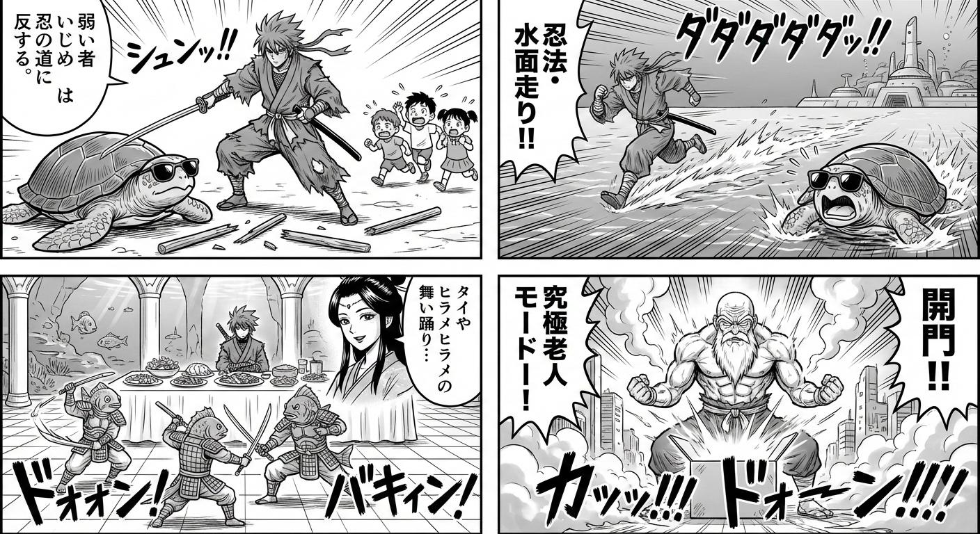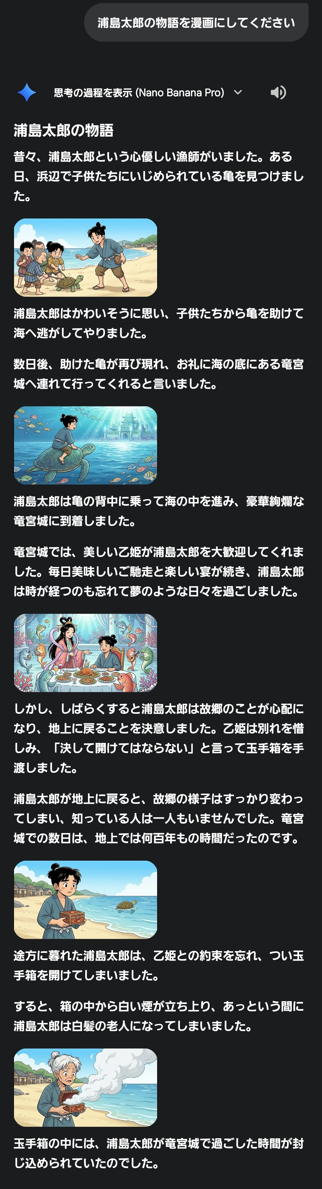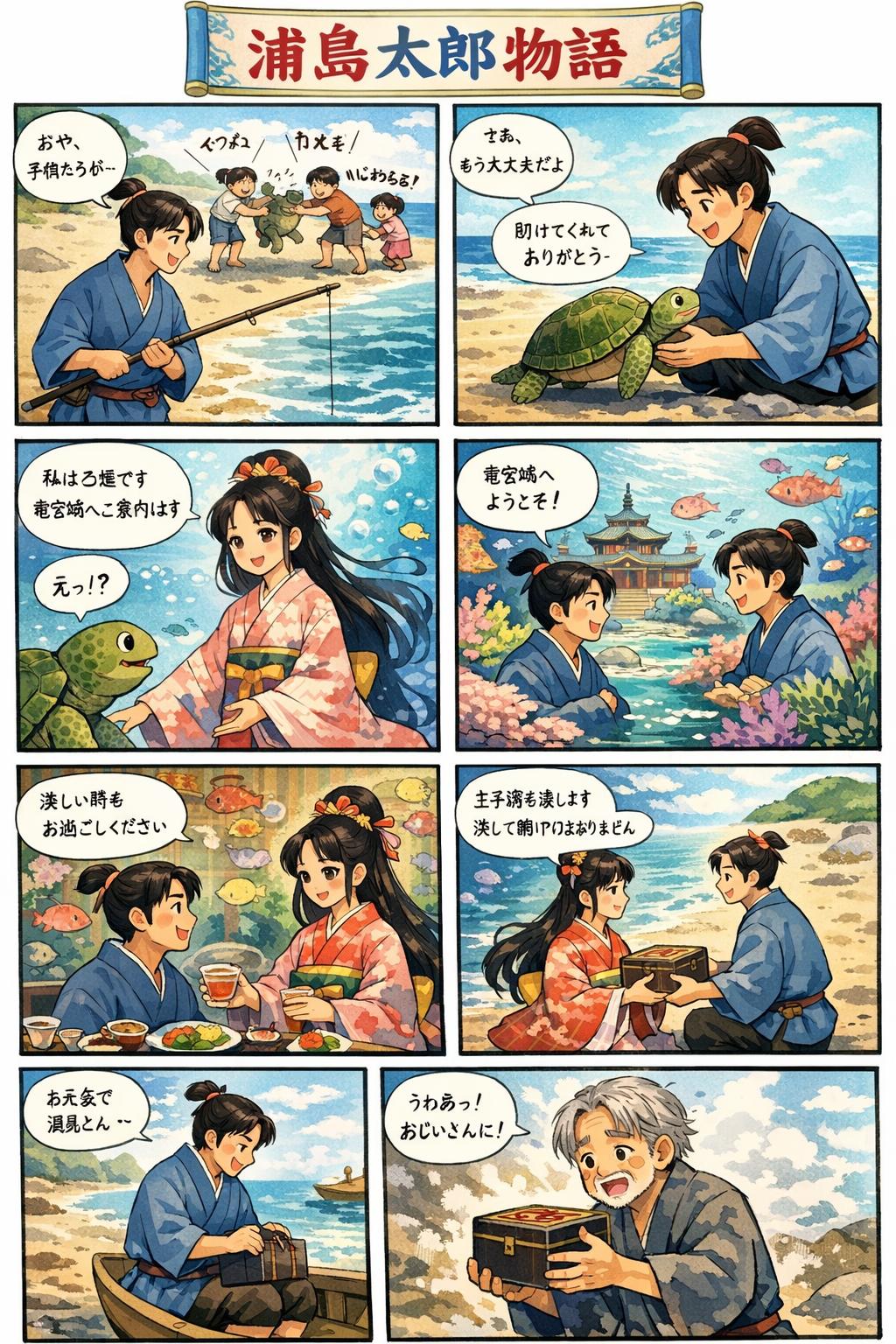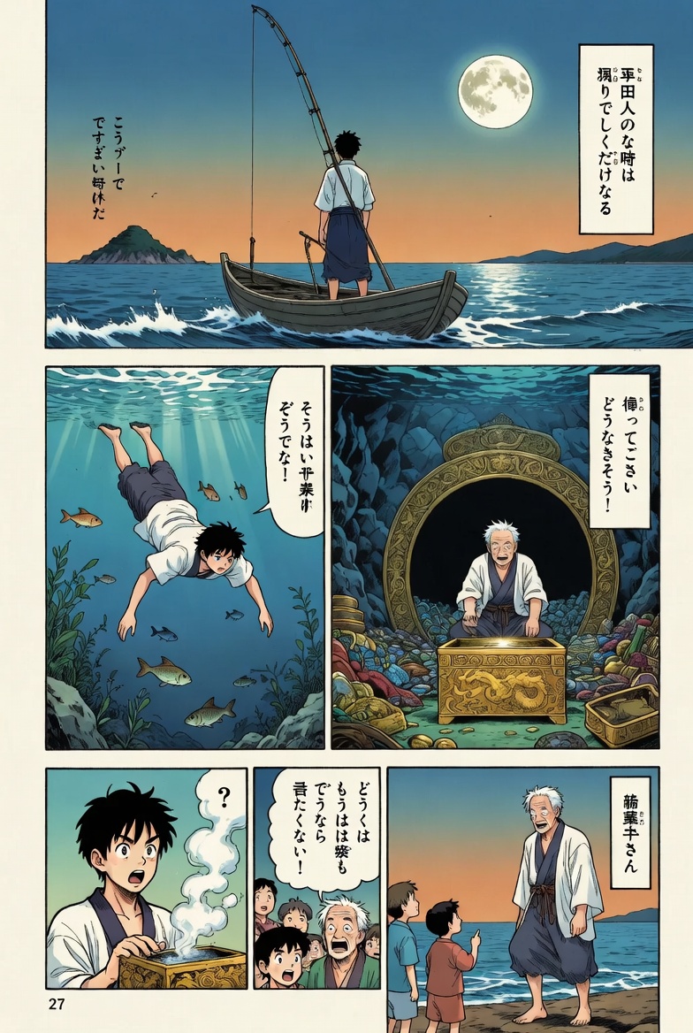 | … | 2526/01/29(木)19:16:17No.1396992837+>>プロンプト:浦島太郎の物語を漫画にしてください >同じプロンプトで試してみた fu6229297.jpg |