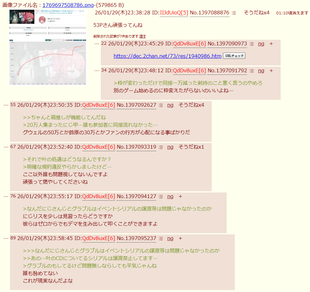 | … | 26126/01/30(金)00:57:25No.1397111820+にじさんじの腐敗はリスナーの責任も多分にあるから反省してね |