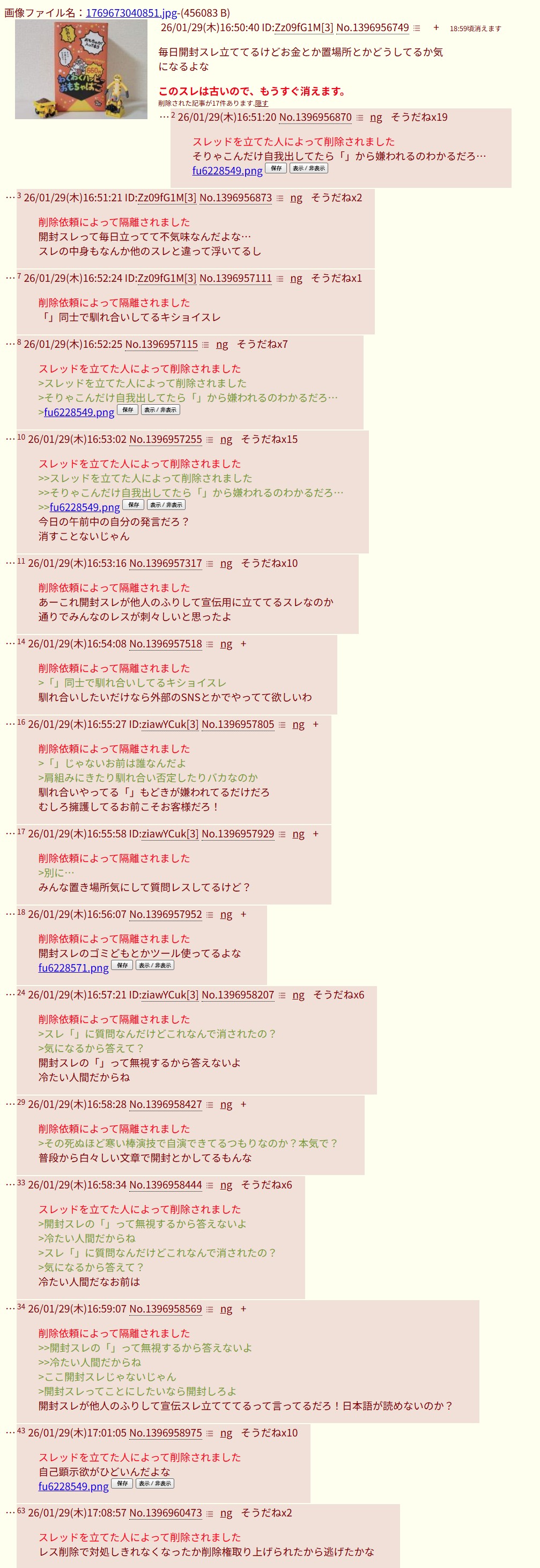 | … | 11426/01/30(金)00:15:39No.1397100549そうだねx2スレッドを立てた人によって削除されました >スレッドを立てた人によって削除されました >>f300704.png >ID出てない隔離されたレスまで含めた奴 >fu6231162.jpg 言論統制するなんて「」とは思えないな |
