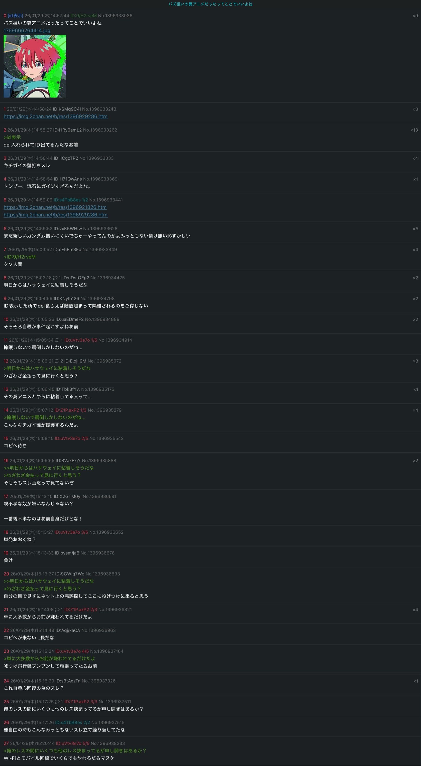 | … | 8026/01/30(金)00:11:58No.1397099302そうだねx3>>ID:D3poE7Tw >IDにも笑われてるじゃねえか だめだった |