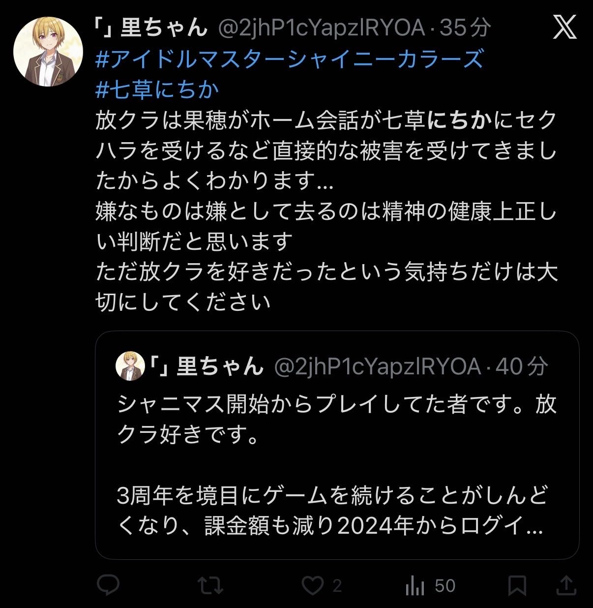 | … | 7926/01/30(金)00:11:57No.1397099294そうだねx4>スレ虫ここでボコボコにされた後は何するの? シャニマス粘着やって心までにちかになるな〜とか鳴き声あげながらスク水着てシコるんじゃないの |