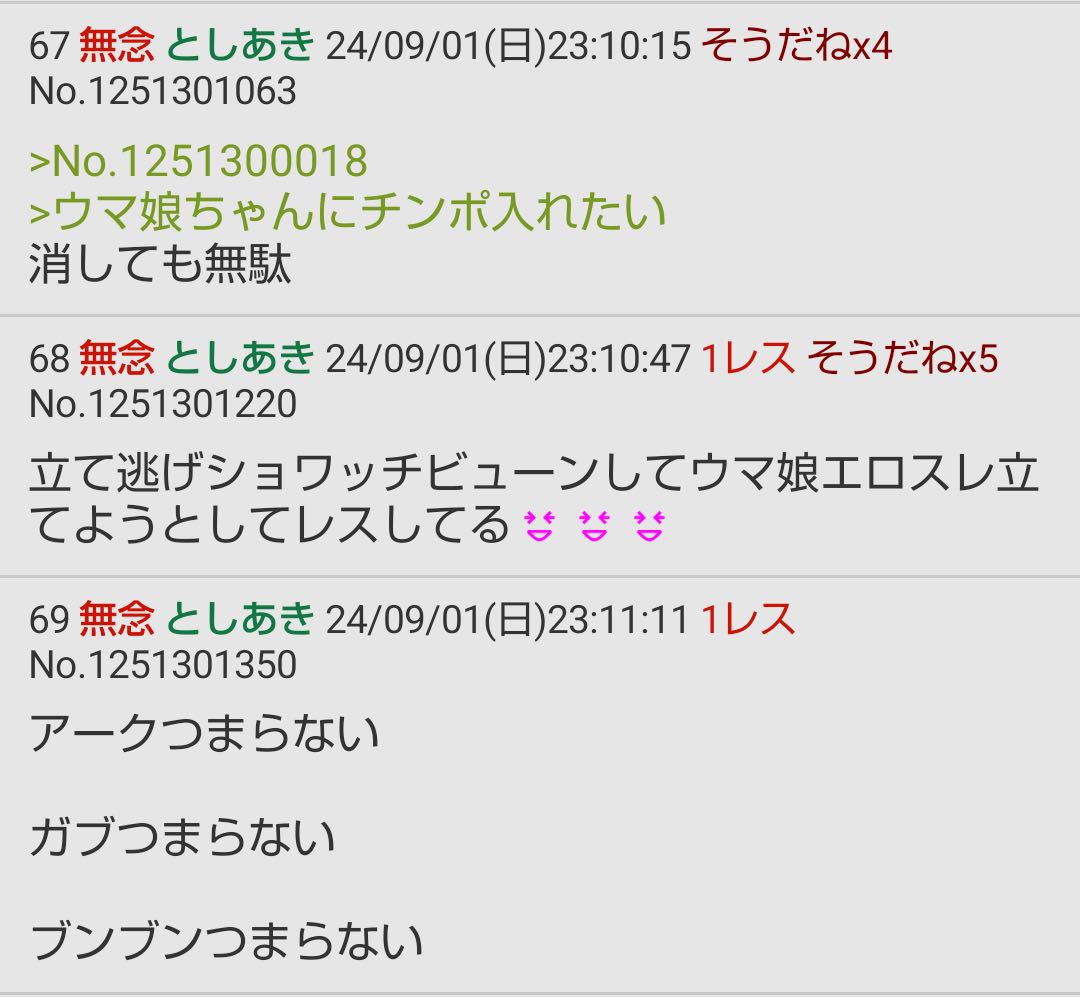 | … | 4926/01/30(金)00:08:13No.1397098168そうだねx1>毎回同じことしか言わないから荒らしとしてもつまんね 殴ってる側もコピペかと思うくらい毎度同じ流れ そろそろ飽きてきた |