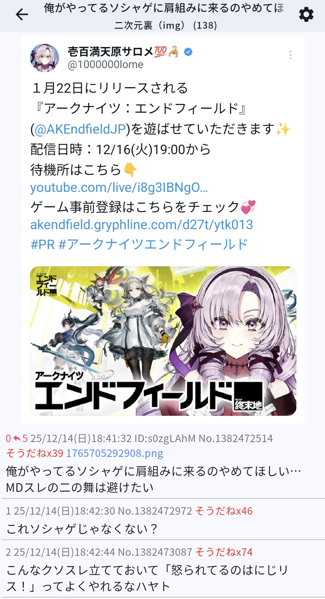 | … | 1026/01/30(金)00:27:40No.1397104095そうだねx19>MDスレでババア呼びしてた時点でただのにじアンなだけ定期 |