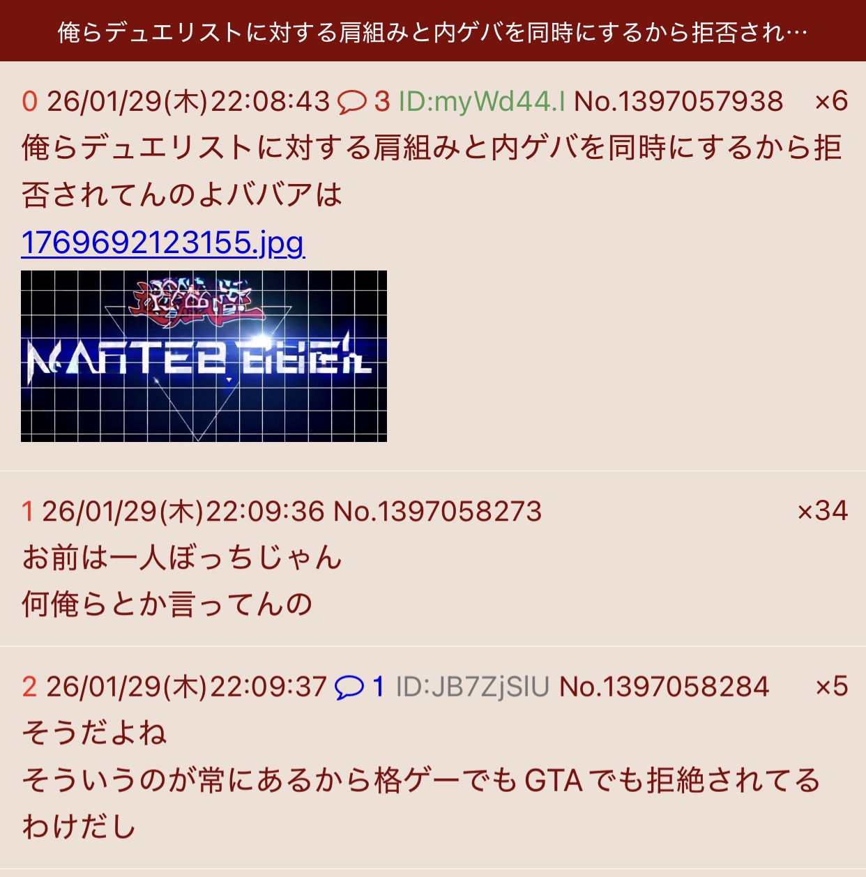 | … | 8026/01/30(金)00:51:27No.1397110463+遊戯王に肩組むのやめてくれないかハヤト |