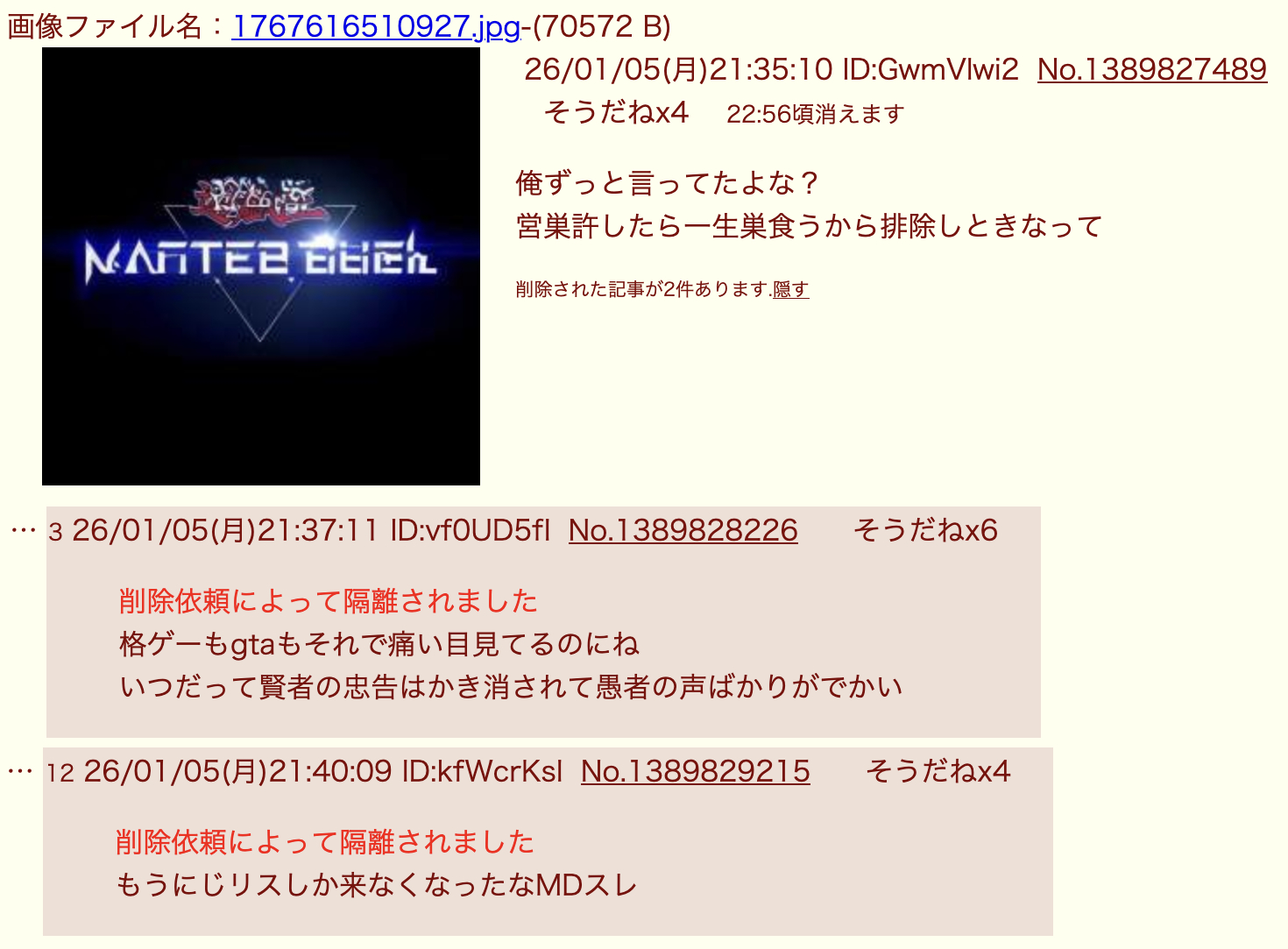 | … | 14226/01/30(金)01:43:11No.1397119236そうだねx1たぶんMDスレで実況始めたら荒らしに来て始めなかったらにじの時はやったのにー!って被害者面するんだろうな |