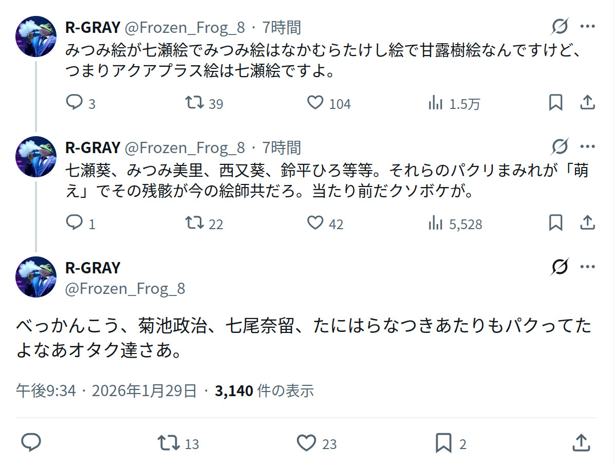 | … | 6026/01/30(金)09:45:22No.1397155515+>七瀬がみつみのパクリだろアホ |