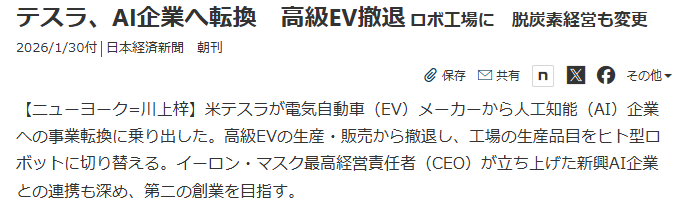 | … | 5026/01/30(金)14:13:51No.1397214815そうだねx3>テスラの本業てEV車じゃなかったのか |
