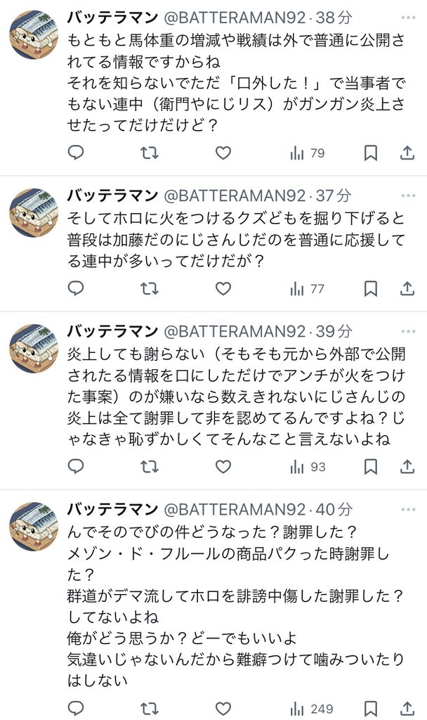 | … | 13526/01/30(金)20:41:53No.1397310471そうだねx4>本当に粘着スレが即座に隔離されるならホロライブのVtuber引退とかであんなにスレ乱立しないと思うんですけど… |