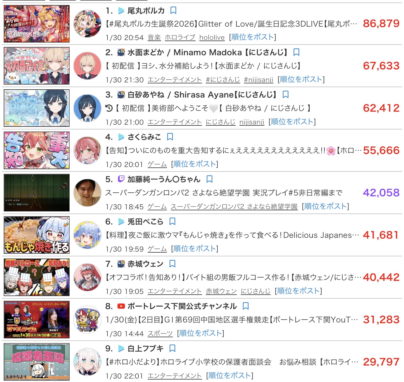 | … | 9726/01/30(金)23:35:04No.1397382521+>ボートレースの配信がこんな視聴者数稼げることあるんだ… |