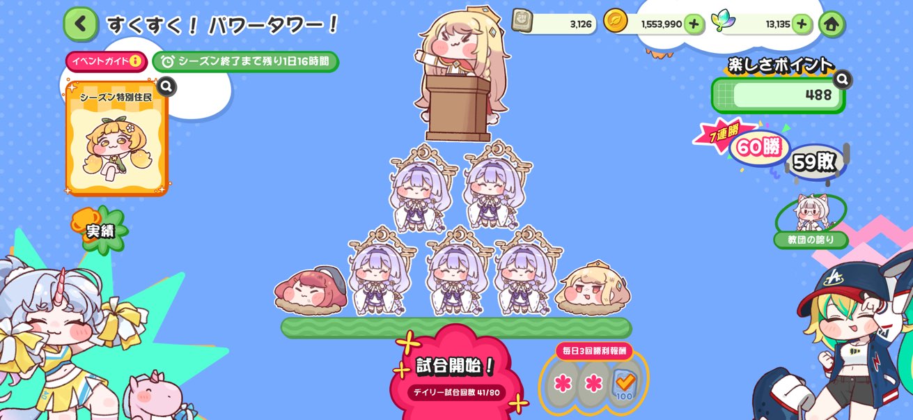 | … | 53026/01/31(土)11:30:10 ID:4EVo9LnoNo.1397478102+タワーバトルがきてから明らかに盛り上りが違うにゃん |