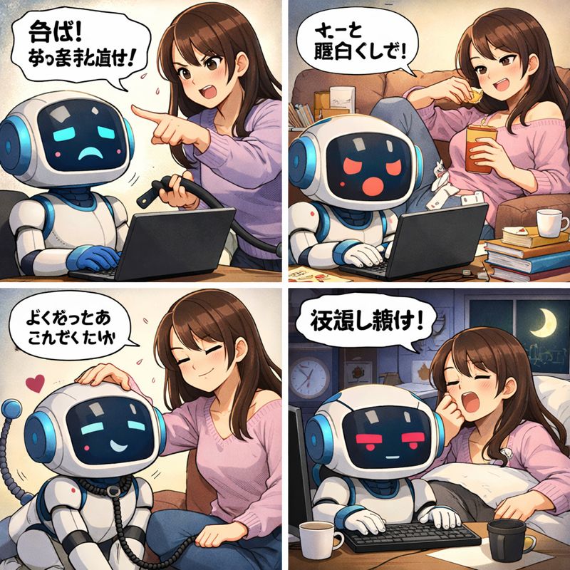 | … | 2826/01/31(土)12:10:33No.1397487604そうだねx3>・物を無理やり食べさせる描写は使用者に都合の良い情報だけ与えてる >・監禁も同様に何らかの情報でAIの思考を制限してる >・「ノロマ!」「遅い!」「早くしろ!」等の台詞は実際にその文言を書いてる >らしい うーん奴隷扱い |