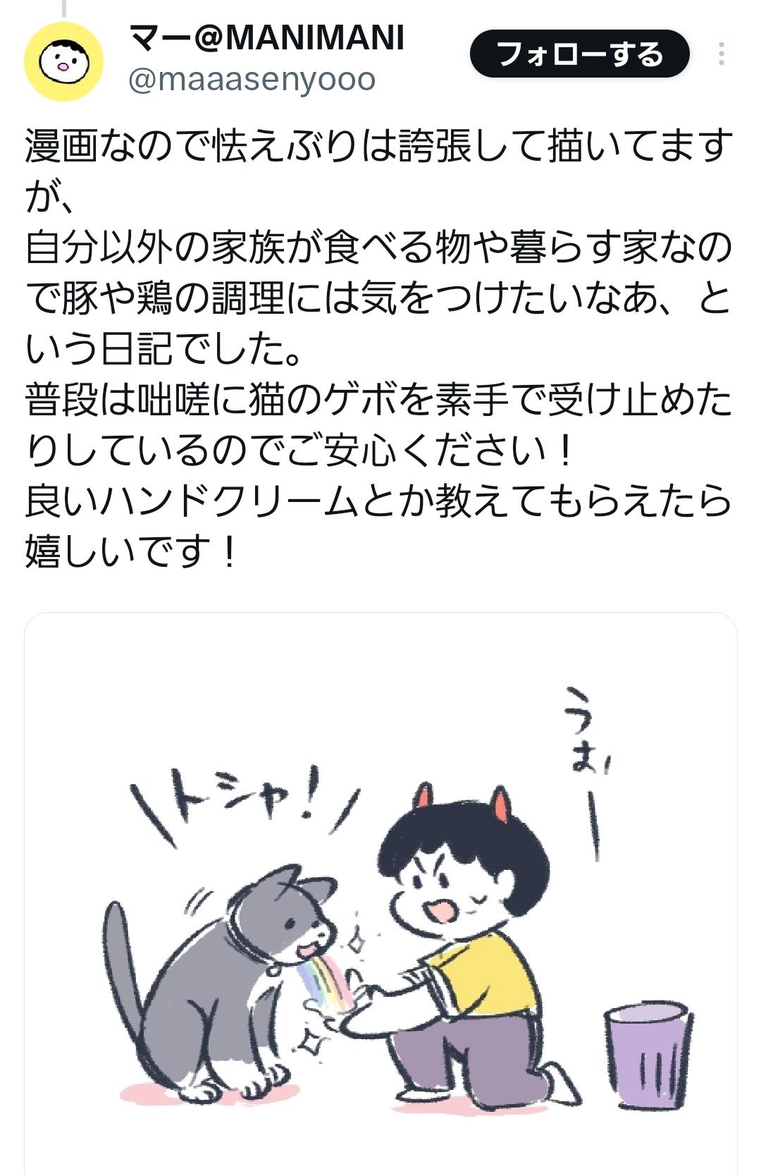 | … | 12726/01/31(土)16:10:03No.1397548592そうだねx1同じ生肉でも鶏肉だけは特別恐怖してる |