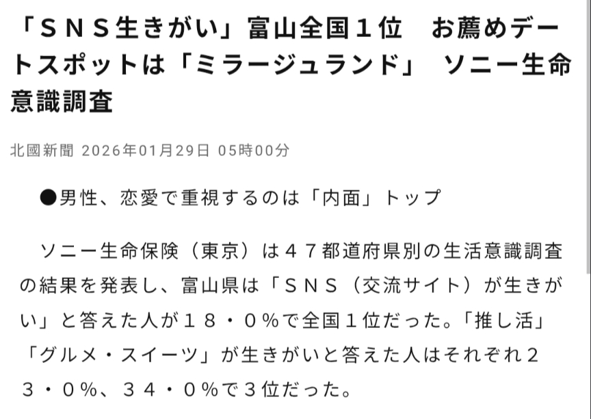 | … | 1126/01/31(土)15:38:21No.1397540770+>インスタ利用率1位の県だぞ富山 |