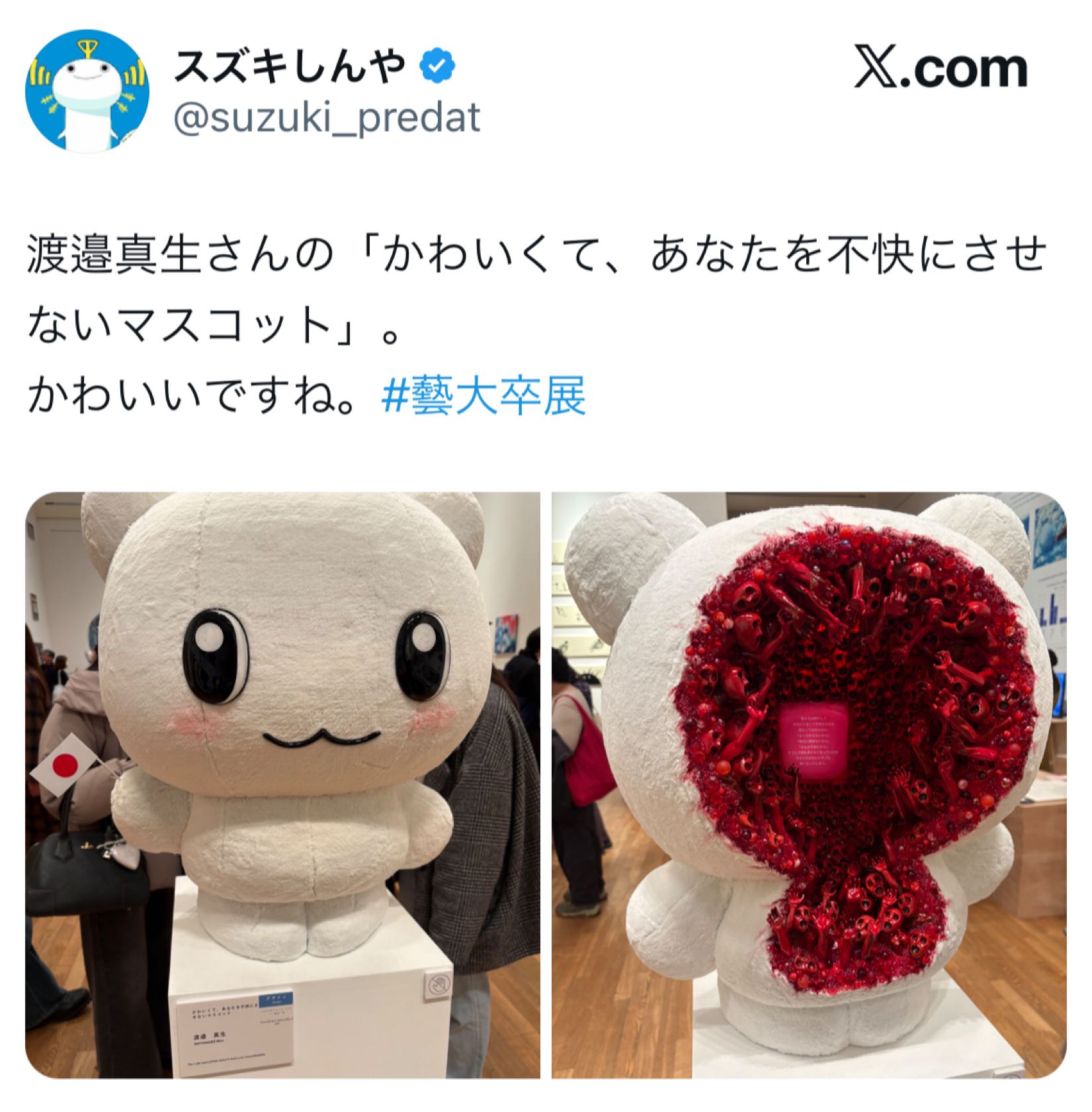 | … | 9126/01/31(土)16:17:51No.1397550655+最近よくTLに藝大の卒業制作流れてくるけど大体訳わかんねえのでこんな事に税金入れなくて良いだろって良からぬ思いを抱いてしまう |