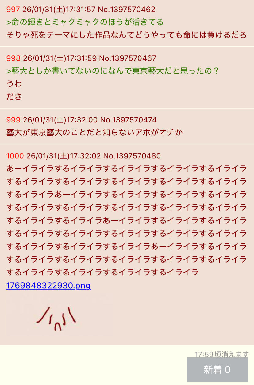| … | 6026/01/31(土)18:39:10No.1397589463+>>あとはここがなくなるか自分の命がなくなるかのどっちが先かだ |