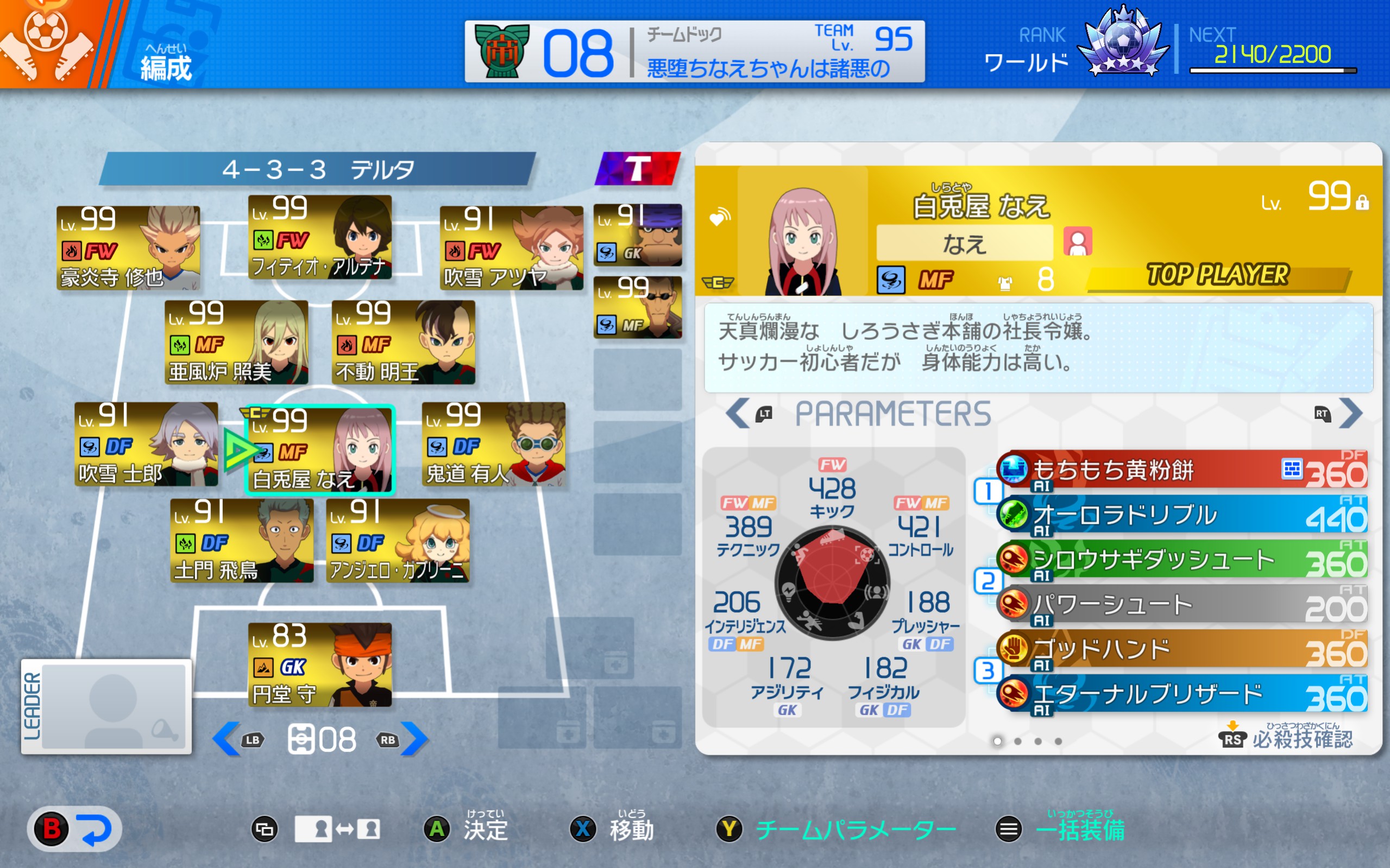 | … | 17326/01/31(土)23:48:09No.1397700132+>まなべ母をBASARA化したんでやんすがパーフェクトコースとディフェンス方程式とウイニングロジックをちゃんと持ちつつ「また抜き」と「スーパーエラシコ」持ってるのこれL5やってるでやんすよ |