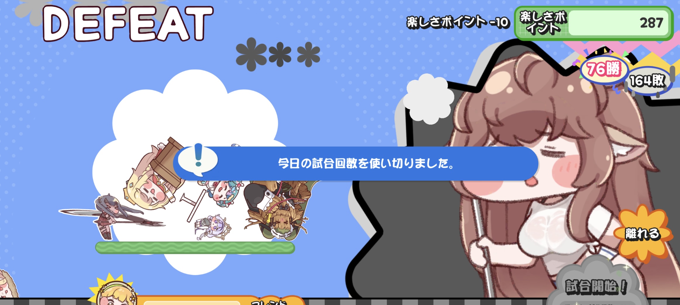 | … | 726/02/01(日)13:50:06 ID:dsndP1SgNo.1397850908そうだねx1離席中っぽいプレイヤーに負けて辛いにゃん… |