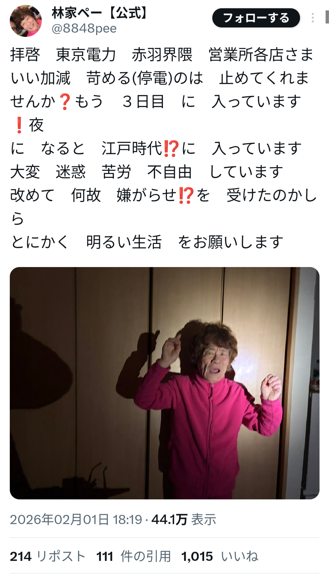 | … | 2526/02/01(日)20:33:04No.1397970196+実際に停電してるの? |