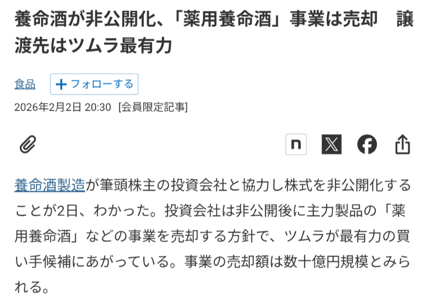 | … | 11426/02/03(火)03:15:11No.1398366297+独立系だったのが2000年代頃に縁あった大正製薬と提携してここが元々大株主だったんだけど元々ジリ貧状況で大正製薬がMBOするときに金足りなくて養命酒の株をファンドに売ったって感じで |