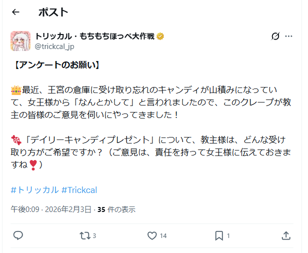 | … | 826/02/03(火)10:02:12 ID:26Awp3l.No.1398394795+>先月のブルミが適当すぎてログボのセリフ読むの忘れてたにゃん |