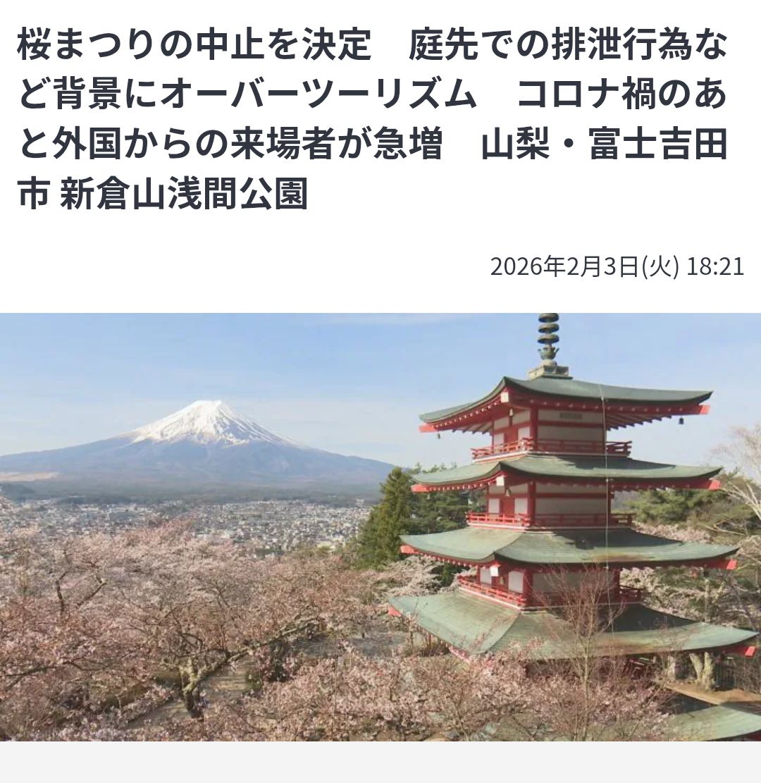 | … | 14526/02/04(水)15:36:26No.1398730211+富士吉田市は有料化などイベントの仕組みづくりを検討し、方針が固まるまではさくら祭りを再開しないということです。 |