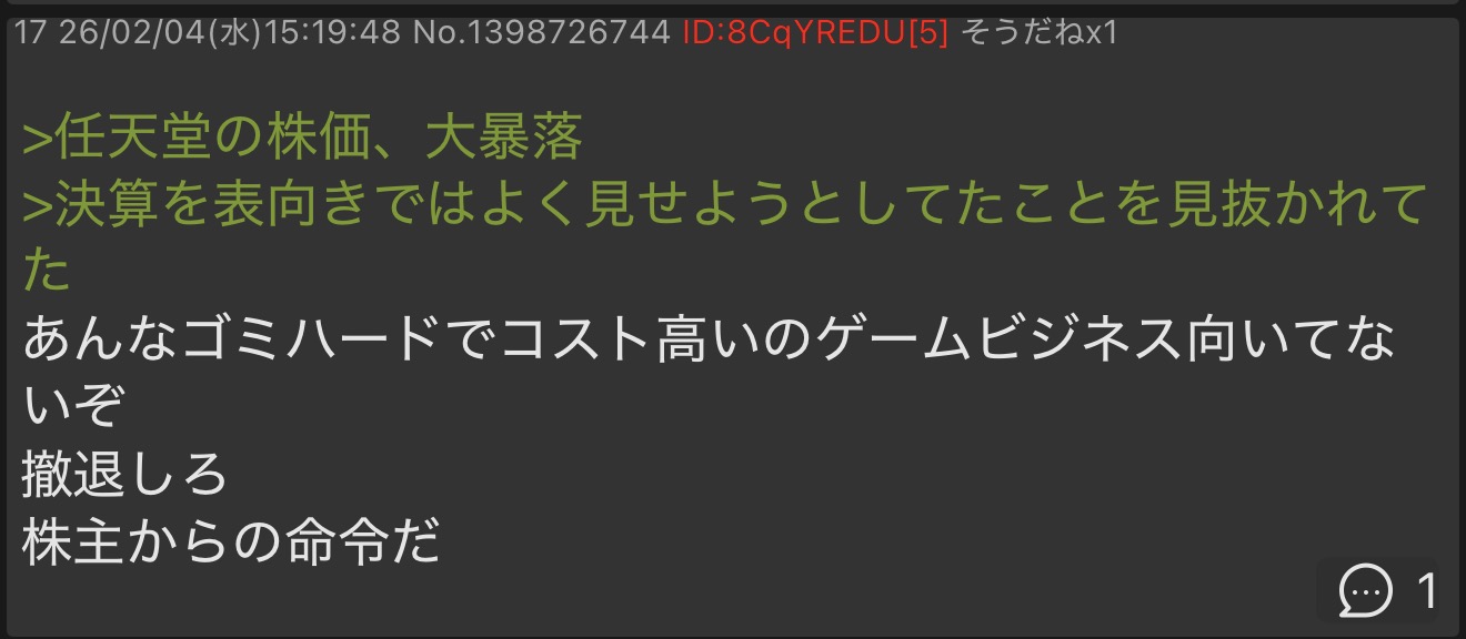 | … | 926/02/04(水)15:45:24No.1398732149そうだねx10>あんなゴミハードでコスト高いのゲームビジネス向いてないぞ |