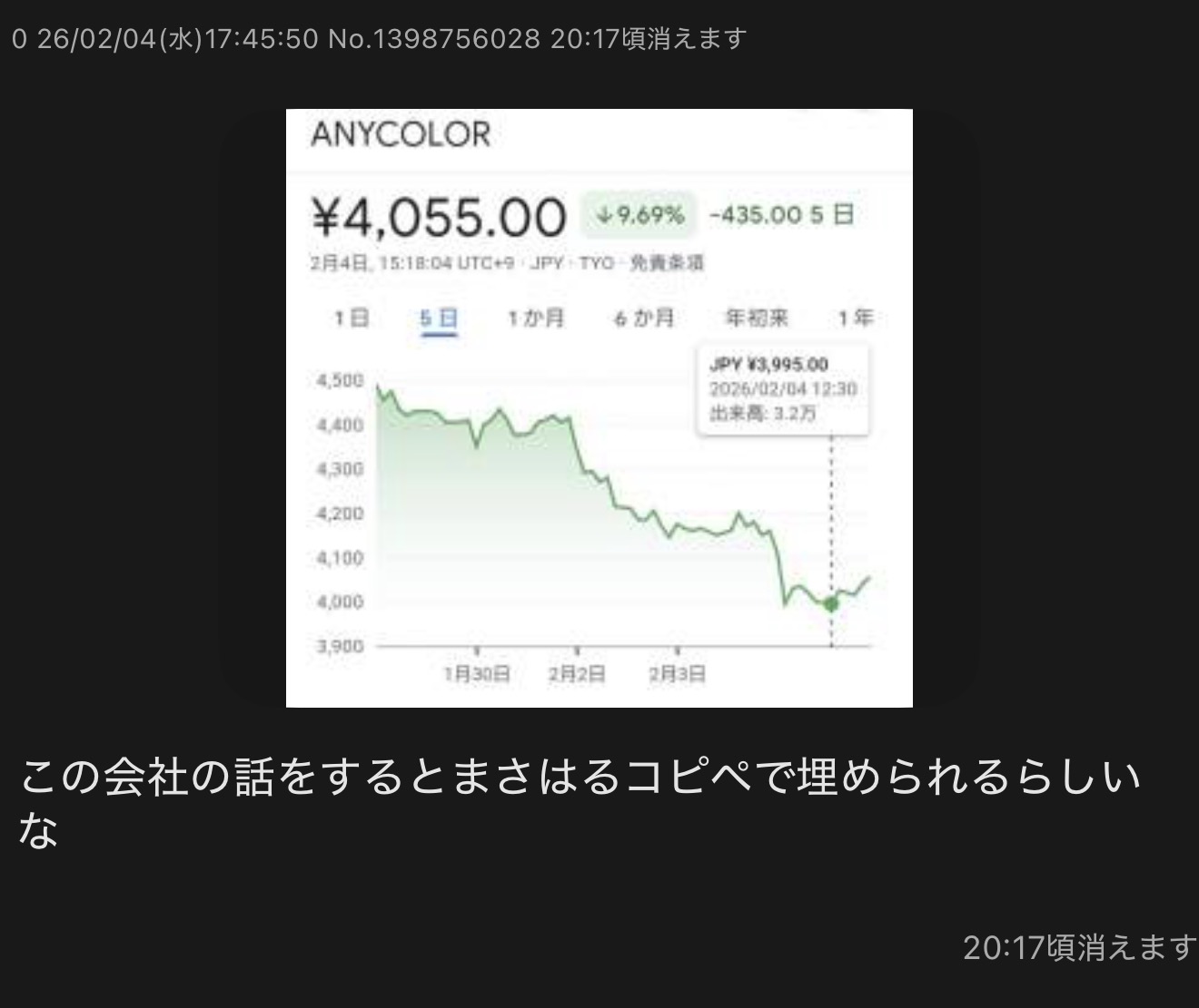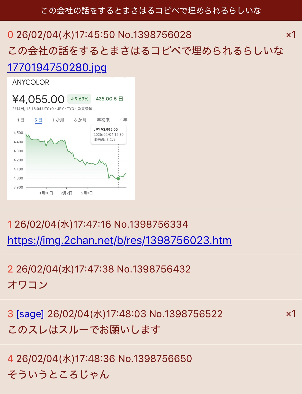 | … | 2726/02/04(水)18:15:29No.1398763749そうだねx4>株価煽りなんてアホのする事だよって言いたいのにここ所属がそんなアホ揃いだから言えない |